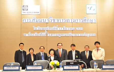 เมื่อวันที่ 13 ธันวาคม 2555 ณ โรงแรมพูลแมน บางกอก คิงพาวเวอร์ กรุงเทพฯ ธนาคารโลกร่วมกับสำนักงานคณะกรรมการการศึกษาขั้นพื้นฐาน (สพฐ.) กระทรวงศึกษาธิการ และสำนักงานส่งเสริมสังคมแห่งการเรียนรู้และคุณภาพเยาวชน (สสค.) จัดสัมมนาวิชาการ "ความเป็นอิสระและความรับผิดชอบของโรงเรียนและการมีส่วนร่วมของภาคเอกชนและท้องถิ่นต่อการจัดการการศึกษาข้ันพื้นฐาน” ดร.แฮร์รี่ แอนโทนี่ พาทรีนอส ผู้จัดการฝ่ายการศึกษา สายงานพัฒนาทรัพยากรมนุษย์ธนาคารโลก และดร.กุสตาโว อาเซีย ที่ปรึกษาทางด้านการศึกษา ธนาคารโลก ได้นำเสนอผลวิจัยในประเด็นความรับผิดชอบของโรงเรียนในการจัดการเรียนการสอนต่อนักเรียน และต่อความต้องการของสังคม