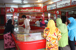 ที่ตัวเมืองยะลา แต่ละวันมีพี่น้องมุสลิมออกมาเลือกซื้อทองกันเป็นจำนวนมาก โดยเฉพาะย่านถนนสายกลาง ถนนระนอง ถนนพังงา และถนนปราจิน ในเขตเทศบาลนครยะลา ซึ่งเป็นศูนย์รวมร้านทอง ลูกค้าส่วนใหญ่เป็นผู้หญิง บางร้านเป็นที่นิยม ถึงขั้นมีลูกค้าเลือกซื้อกันจนแน่นขนัด เครื่องประดับที่ขายดีก็คือสร้อยคอทองคำ กำไลทองคำ และแหวนทองคำ สนนราคาอยู่ที่ราวๆ บาทละ 18,000-19,000 บาท