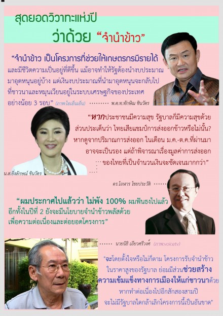 ในรอบปีที่ผ่านมา มีผู้ออกมาแสดงความคิดความเห็นเกี่ยวกับ 'โครงการรับจำนำข้าว' จำนวนมาก ทั้งฝ่ายที่ถูกมองว่า คัดค้าน ฝ่ายที่เห็นด้วยกับรัฐบาล รวมถึงคนในรัฐบาลเอง ที่ออกมายืนยันเสียงหนักแน่นว่า โครงการนี้ดีต่อชีวิต ความเป็นอยู่ของชาวนา รวมทั้งเศรษฐกิจของประเทศ