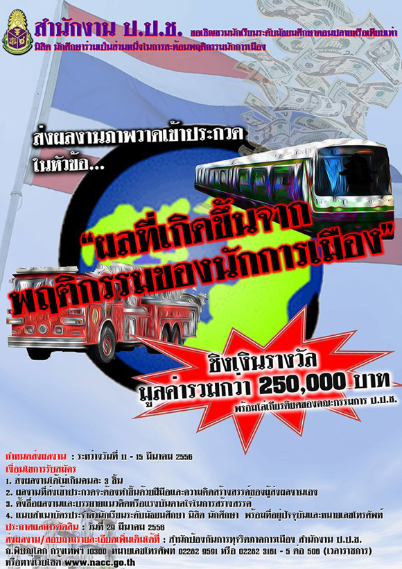 โดยผู้สนใจสามารถส่งผลงานเข้าประกวดเป็นลักษณะ 2 มิติ ประเภทจิตรกรรม หรือภาพพิมพ์ หรือสื่อผสมโดยไม่จำกัดเทคนิคและชนิดของสี เพื่อชิงเงินรางวัลมูลค่ารวมกว่า 250,000 บาท พร้อมโล่เกียรติยศของคณะกรรมการป.ป.ช. โดยแบ่งประเภทรางวัลออกเป็น 2 ระดับ คือ ระดับอุดมศึกษาและประกาศนียบัตรวิชาชีพชั้นสูง (ปวส.) ระดับมัธยมศึกษาตอนปลายหรือเทียบเท่า หมดเขตส่งผลงานภายในวันที่ 15 มีนาคม 2556 นี้