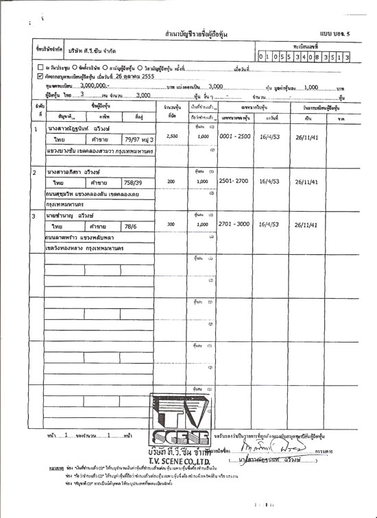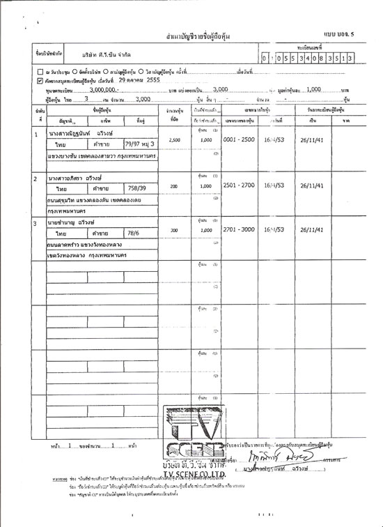 วันที่ 29 ตุลาคม 2555 มีการเปลี่ยนแปลงผู้ถือหุ้น นางสาวณัฎฐ์นันท์ ถือหุ้นเพิ่มขึ้นเป็น 2,500 หุ้น (รับโอนมาจากนางสาวศันสนีย์ 500 หุ้น) มีนางสาวอภิสรา ฉวีวงษ์ และนายชำนาญ ฉวีวงษ์ ร่วมถือหุ้น (สำเนาผู้ถือหุ้นอีกฉบับระบุว่าโอนเมื่อวันที่ 26 ตุลาคม 2555)