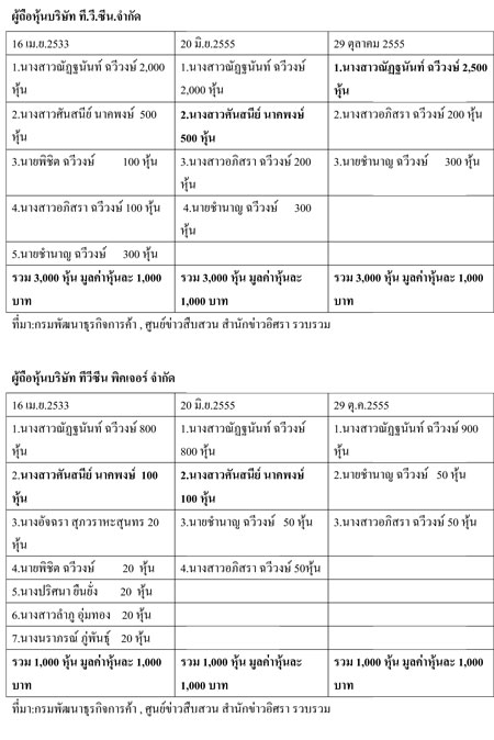 ทั้งนี้ บริษัท ที.วี.ซีน จำกัด จดทะเบียนเมื่อวันที่ 4 กันยายน 2534 ทุนปัจจุบัน 3 ล้านบาท ประกอบธุรกิจรับจ้างถ่ายละคร ที่ตั้งเลขที่ 282 ซอยลาดพร้าว 94 ถนนลาดพร้าว เขตวังทองหลาง กรุงเทพมหานคร ณ วันที่ 20 มิถุนายน 2555 นางสาวณัฏฐนันท์ ฉวีวงษ์ ถือหุ้นใหญ่ 2,000 หุ้น นางสาวศันสนีย์ 500 หุ้น นางสาวอภิสรา ฉวีวงษ์ 200 หุ้น และนายชำนาญ ฉวีวงษ์ 300 หุ้น