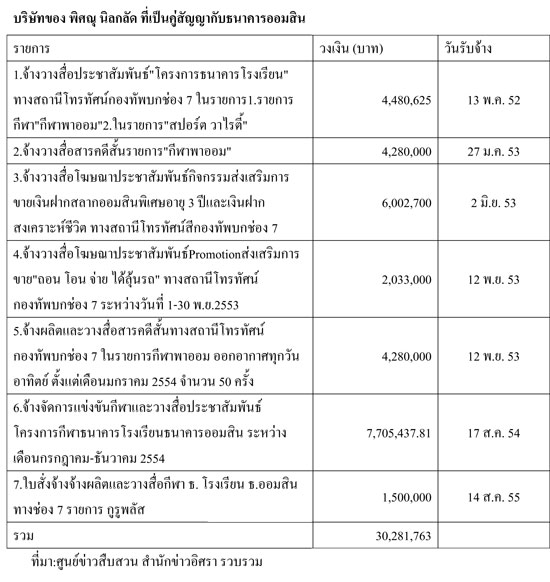 ล่าสุดวันที่ 14 ส.ค. 55 ธนาคารออมสินว่าจ้างผลิตและวางสื่อกีฬา ทางช่อง 7 รายการ กูรูพลัส วงเงิน 1,500,000 บาท (ดูตาราง)