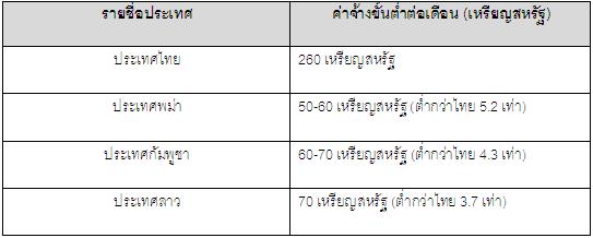 ค่าแรงที่สูงกว่าประเทศเพื่อนบ้านของไทยจะเป็นการกดดันให้มีแรงงานผิดกฎหมายไหลเข้าสู่ประเทศไทยมากขึ้นกว่าเดิม โดยตารางข้างล่างเปรียบเทียบค่าแรงไทยกับประเทศเพื่อนบ้าน ดังนี้