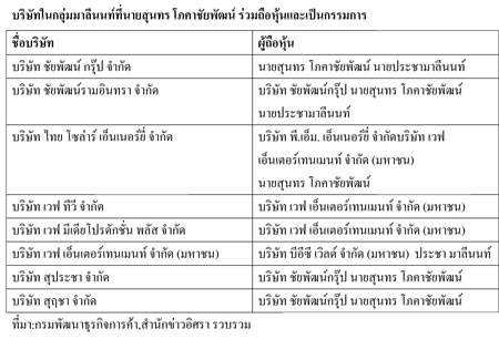 ทั้งนี้ นายสุนทร โภคาชัยพัฒน์ เป็นกรรมการและถือหุ้นกลุ่มบริษัทชัยพัฒน์กรุ๊ป (บริษัทส่วนตัวนายประชา) กรรมการ บริษัท ไทย โซล่าร์ เอ็นเนอร์ยี่ จำกัด และ บริษัท เวฟ เอ็นเตอร์เทนเมนท์ จำกัด (มหาชน) นับสิบแห่งซึ่งมีนายประชา มาลีนนท์ และกลุ่มบีอีซีเวิลด์เป็นเจ้าของ (ดูตาราง 2)