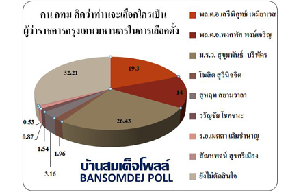เมื่อถามว่าจะเลือกผู้สมัครรายใดประชาชนส่วนใหญ่ใน กทม.ส่วนใหญ่ ตอบว่า ยังไม่ตัดสินใจ 32.21% รองลงมาเลือก ม.ร.ว.สุขุมพันธุ์ บริพัตร 26.43% เลือก พล.ต.อ.เสรีพิศุทธิ์ เตมียาเวส 19.30 เลือก พล.ต.อ.พงศพัศ พงษ์เจริญ 14.00% และเลือกนายสุหฤท สยามวาลา 3.16%