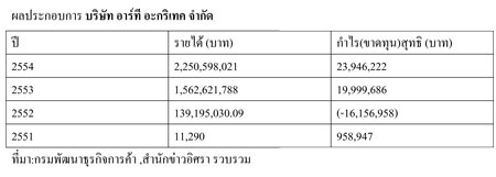แจ้งผลประกอบการ ปี 2554 รายได้ 2,250,598,021 บาท กำไรสุทธิ 23,946,222 บาท สินทรัพย์ 807,808,999.95 บาท หนี้สิน 601,014,424.10 บาท กำไรสะสม 26,794,575 บาท (ดูตาราง)