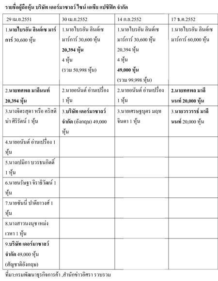 30 เม.ย.2552 นายทศพล มาลีนนท์ ได้โอนหุ้นให้ นายไบรอัน ลินด์เซ มาร์การ์