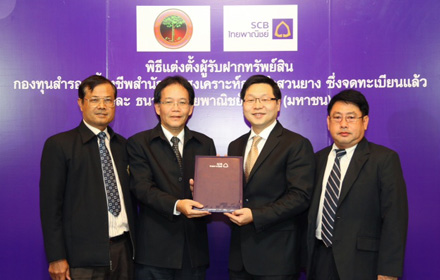กองทุนสำรองเลี้ยงชีพสำนักงานสงเคราะห์การทำสวนยาง ซึ่งจดทะเบียนแล้ว แต่งตั้งธนาคาร ไทยพาณิชย์ให้เป็นผู้รับฝากทรัพย์สิน (Custodian) ของกองทุนมูลค่าทรัพย์สินสุทธิกว่า 2,100 บาท เริ่มมีผลตั้งแต่วันที่ 1 กุมภาพันธ์ 2556 เป็นต้นไป โดยมี นายชัยวัฒน์ ฉันติกุล ประธานคณะกรรมการกองทุนสำรองเลี้ยงชีพ และนายไตรรงค์ บุตรากาศ ผู้ช่วยผู้จัดการใหญ่สาย GTS ธนาคารไทยพาณิชย์ ร่วมลงนาม ณ ธนาคารไทยพาณิชย์ สำนักงานใหญ่ (รัชโยธิน)
