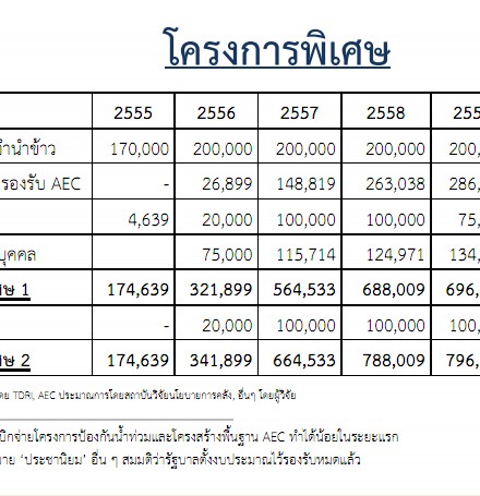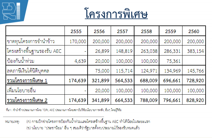 "คาดการณ์ว่าตั้งแต่ปี 2556 เป็นต้นไป การขาดทุนจากโครงการจำนำข้าว จะขาดทุนปีละ 200,000 ล้านบาท ซึ่งรัฐบาลควรให้ความสำคัญในการวางมาตรการควบคุมไม่ให้เกิดหนี้สาธารณะที่สูงเกิน"