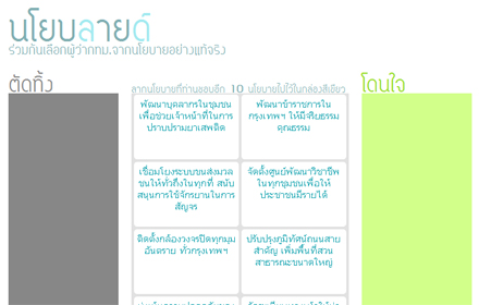 โดยโปรแกรมจะเปิดโอกาสให้คุณสามารถคลิกลากนโยบายที่ไม่ชอบไปไว้ในกล่องด้านซ้ายพื้นสีเทาที่เขียนว่า “ตัดทิ้ง” ส่วนนโยบายที่ชื่นชอบสามารถคลิกลากไปไว้ในกล่องด้านขวาพื้นสีเขียวที่เขียนว่า “โดนใจ”