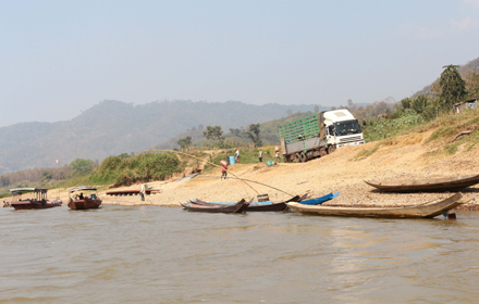 (ประมงน้ำจืดแม่น้ำโขง กับการขนถ่ายสินค้าระหว่างกันด้วยเรือข้ามฟากแล้วมีรถบรรทุกมารอรับตลอดแนวชายแดน)