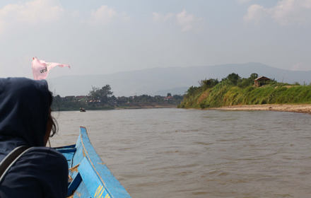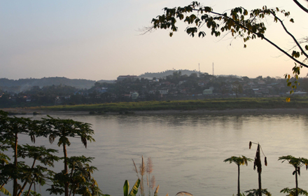 (ทัศนียภาพลำน้ำโขง เมื่อมองไกลออกไปจะเห็นเมืองเชียงของฝั่งไทยซึ่งเป็นเมืองที่ทอดตัวยาวตามแนวแม่น้ำ)
