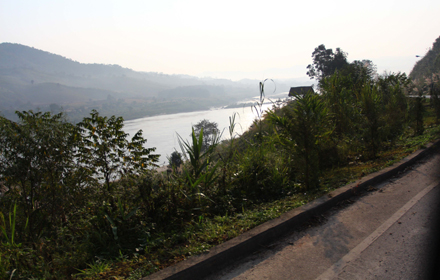 (ถนนสายเชียงแสน-เชียงของฝั่งไทย เป็นถนนที่มีทัศนียภาพสวยงามที่สุดเส้นหนึ่ง เพราะทอดตัวขนาดไปตามลำน้ำโขงบน ดอยสูง เมื่อมองลงไปเบื้องล่างช่วยให้หายเหนื่อยจากการเดินทางเป็นปลิดทิ้ง)