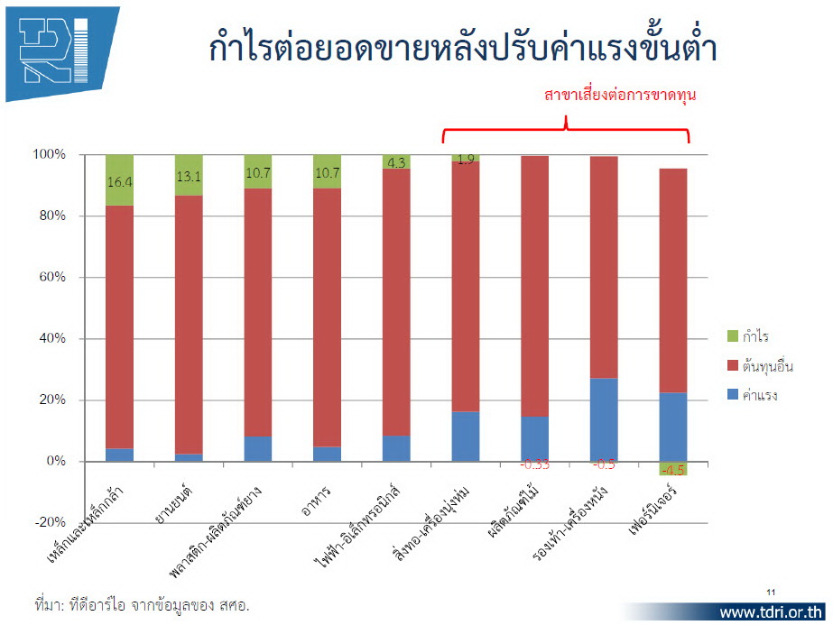 งานนำเสนอดังกล่าวชี้ให้เห็นว่าการปรับเพิ่มค่าจ้างขั้นต่ำจะส่งผลต่อภาคการผลิตที่ใช้แรงงานเข้มข้น เช่น ธุรกิจเครื่องนุ่งห่มซึ่งจะมีการเพิ่มขึ้นค่าแรงร้อยละ 47.7 ธุรกิจสิ่งทอเพิ่มขึ้นร้อยละ 46.3 เมื่อเทียบกับภาคการผลิตที่ใช้เครื่องจักรกลและเทคโนโลยีเป็นหลักเช่น เหล็ก เครื่องจักรและอุปกรณ์ ยานยนต์ และเครื่องใช้ไฟฟ้าที่มีการเพิ่มขึ้นค่าแรงเฉลี่ยอยู่ที่ร้อยละ 15 – 20 ดังนั้น ธุรกิจที่ใช้แรงงานเข้มข้นต้องเผชิญกับโครงสร้างต้นทุนและกำไรต่อยอดขายที่เปลี่ยนไปอย่างมาก โดยแบบจำลองทางเศรษฐกิจชี้ให้เห็นว่า ธุรกิจสิ่งทอ-เครื่องนุ่งห่ม ผลิตภัณฑ์ไม้ รองเท้า-เครื่องหนัง และเฟอร์นิเจอร์เป็นสาขาที่เสี่ยงต่อการขาดทุนอย่างมากเนื่องจากกำไรต่อยอดขายที่ลดลงอย่างมากหลังการปรับค่าจ้างขั้นต่ำดังภาพด้านล่างนี้