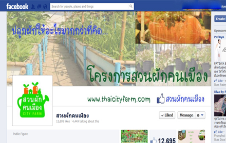 เพจ ‘สวนผักคนเมือง’ (https://www.facebook.com/thaicityfarm) ของมูลนิธิกสิกรรมยั่งยืน (ประเทศไทย) และภาคีเครือข่าย (www.thaicityfarm.com) เป็นเพจยอดนิยมหนึ่งที่ส่งเสริมความรู้ภาคการเกษตร ภายใต้การสนับสนุนทุนของสำนักงานกองทุนสนับสนุนการเสริมเสริมสุขภาพ (สสส.) ‘สวนผักคนเมือง’เป็นโครงการที่ส่งเสริมให้คนเมืองทำการเกษตรด้วยการปลูกผักสวนครัวไว้รับประทานเอง ซึ่งนอกจากจะช่วยแก้ปัญหาด้านสุขภาพ ทำให้คนเมืองมีอาหารปลอดภัยไว้บริโภคแล้ว ยังมีส่วนช่วยลดค่าใช้จ่ายในครัวเรือน และพึ่งพาตนเองด้านอาหารได้มากขึ้น