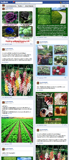 ศูนย์ข่าวเพื่อชุมชน สำนักข่าวอิศราได้พูดคุยกับเจ้าของแฟนเพจธุรกิจการเกษตรรายย่อย 2 รายที่หันมาใช้เฟสบุ๊คเป็นช่องทางจำหน่ายสินค้าในปีที่ผ่านมา รายแรก คือ นางสาวรัชนก ศิริพัฒน์ นักศึกษาชั้นปีที่ 4 มหาวิทยาลัยแม่โจ้ จ.เชียงใหม่ เจ้าของเพจเฟสบุ๊ค ‘2K Flower seeds จำหน่ายเมล็ดพันธุ์ไม้ดอกประดับ’ (https://www.facebook.com/2kflowerseeds)ซึ่งเล่าว่า สนใจขายเมล็ดพันธุ์ทางเฟสบุ๊คเพราะต้องการมีรายได้เสริมและเห็นว่าเฟสบุ๊คเป็นช่องทางที่สะดวกในการเข้าถึงลูกค้า โดยเริ่มจำหน่ายตั้งแต่เดือนพฤษภาคม 2555 (มียอดผู้กด ‘ถูกใจ’ ปัจจุบันกว่า 300 ราย) โดยลูกค้าส่วนใหญ่มีหลากหลายกลุ่ม ทั้งคนทำงาน วัยรุ่นและเกษตรกร ซึ่งรู้จักเพจของร้านผ่านการค้นหาชื่อเมล็ดพันธุ์ดอกไม้ในกูเกิ้ล โดยมีเมล็ดพันธุ์ไม้ดอกไม้ประดับจำหน่ายกว่า 40 พันธุ์ ราคาขายตั้งแต่ซองละ 35 บาท (เช่น ดาวเรืองฝรั่งเศสบรรจุ 270-400 เมล็ด)ไปจนถึงราคาชั่งขาย 1 กิโลกรัม 10,000 บาท ตกกรัมละ 10 บาท เป็นต้น