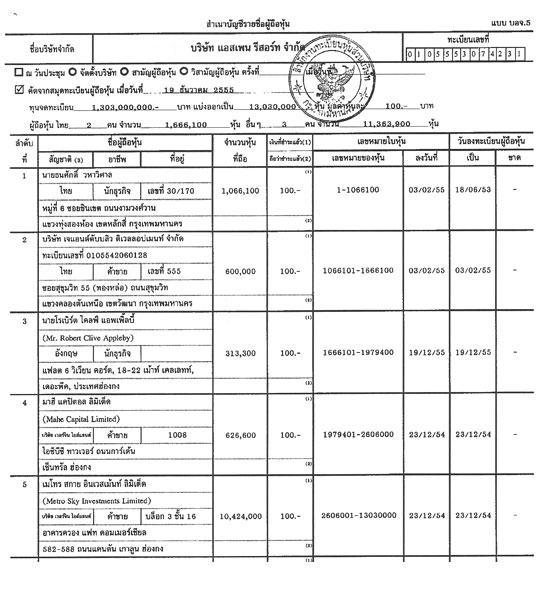 1. เดอะ โรเบิร์ต แอพเพิ้ลบี้ ไลฟ์ อินเทอร์เรส ทรัสต์ (The Robert Apple Life Interest Trust) สัญชาติเกิร์นซีย์ ที่อยู่ 1008 ไอบีซี ทาวเวอร์ ถนนการ์เด้น เซ็นทรัล ฮ่องกง จำนวน 313,300 หุ้น