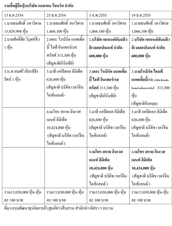ต่อมาวันที่ 23 ธ.ค.2554 บริษัท แอสเพน รีสอร์ท จำกัด ได้จดทะเบียนเพิ่มทุนเป็น 1,303 ล้านบาท นายธนศักดิ์ วหาวิศาล ถือหุ้นใหญ่ 1,666,100 หุ้น และมีผู้ถือหุ้นต่างชาติ 3 รายเข้ามาร่วมถือหุ้น
