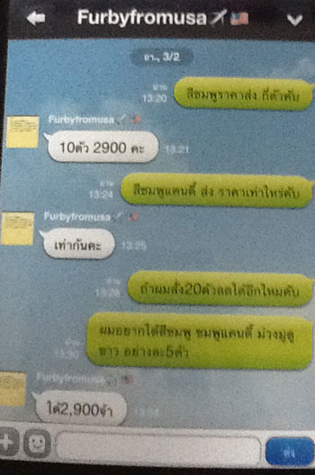 “ดิฉันสั่งซื้อตุ๊กตาเฟอร์บี้ 2 ตัว เป็นของตัวเองหนึ่งตัว และของเพื่อนอีก 1 คน เพื่อนำมาเล่นเอง ตอนแรกก็ไม่รู้ว่าจะไปหาของที่ไหน เพราะทราบว่ามันขาดตลาด พอดีไปเจออินสตาแกรมนี้ ก็เลยเข้าไปติดต่อ พร้อมแอด LiNE ของ "อิ๊ง" มาไว้เป็นช่องทางติดต่อกัน ก่อนจะโอนเงินไปให้ในเวลาต่อมา”