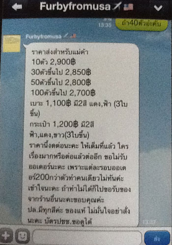 “พี่ติดต่อกับคนชื่อแอม เขาบอกว่าสามารถหาเฟอร์บี้ให้ได้ และขอให้โอนเงินไปให้กับคนชื่อเจนนี่ เพิ่งมาทราบที่หลังว่า ของที่จะนำมาให้ต้องไปสั่งกับ คนชื่อ พลอยอีกครั้ง ตอนนี้ติดต่อทั้งแอม และเจนนี่ไม่ได้เลย ไม่รู้จะทำอย่างไรเหมือนกัน”