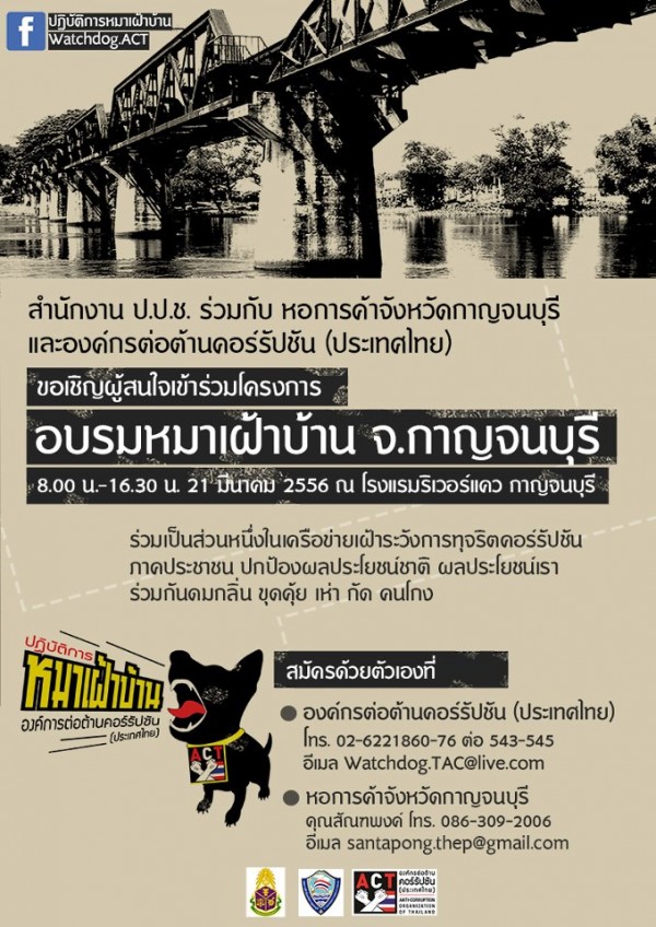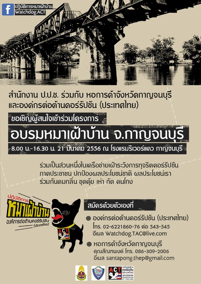 สำนักงาน ป.ป.ช. ร่วมกับ หอการค้าจังหวัดการญจนบุรี และองค์กรต่อต้านคอร์รัปชั่น (ประเทศไทย) เชิญผู้สนใจเข้าร่วมโครงการ อบรมหมาเฝ้าบ้าน จ.กาญจนบุรี