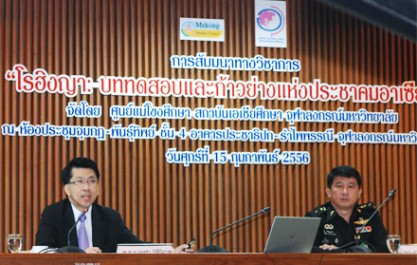 ศูนย์แม่โขงศึกษา สถาบันเอเชียศึกษา จุฬาลงกรณ์มหาวิทยาลัย จัดสัมมนาวิชาการ "โรฮิงญา : บททดสอบและก้าวย่างแห่งประชาคมอาเซียน" เมื่อ 15 ก.พ. โดยมี รศ.ดร.สุเนตร ชุตินธรานนท์ ผู้อำนวยการสถาบันเอเชียศึกษา กล่าวเปิดงานสัมมนา พร้อมด้วยวิทยากร ได้แก่ นายสมชาย หอมลออ รองประธานอนุกรรมการสิทธิพลเมือง และสิทธิทางการเมือง จากสำนักงานคณะกรรมการสิทธิมนุษยชนแห่งชาติ ศ.สุริชัย หวันแก้ว ผู้อำนวยการศูนย์ศึกษาสันติภาพและความขัดแย้ง จุฬาลงกรณ์มหาวิทยาลัย พันเอก ดร.ธีรนันท์ นันทขว้าง รองผู้อำนวยการกองยุทธศาสตร์และความมั่นคง วิทยาลัยป้องกันราชอาณาจักร และ พันตำรวจเอกอนุชา กิติวิภาต จากสำนักงานตรวจคนเข้าเมือง