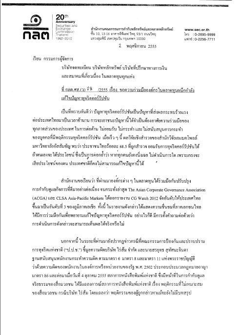 ผู้สื่อข่าวรายงานว่า เมื่อวันที่ 2 พ.ย.2555 สำนักงานคณะกรรมการกำกับหลักทรัพย์และตลาดหลักทรัพย์ (ก.ล.ต.) ได้ส่งหนังสือที่ กลต.ศส.(ว) 28/2555 เรื่อง ขอความร่วมมือองค์กรในตลาดทุนผนึกกำลังแก้ไขปัญหาทุจริตคอร์รัปชั่น ถึงกรรมการผู้จัดการ บริษัทจดทะเบียน บริษัทหลักทรัพย์ บริษัทที่ปรึกษาทางการเงิน และสมาคมที่เกี่ยวเนื่อง ในตลาดทุนทุกแห่ง โดยหนังสือดังกล่าวมีใจความว่า เป็นที่ทราบกันดีว่า ปัญหาทุจริตคอร์รัปชั่นเป็นปัญหาที่ส่งผลกระทบร้ายแรงต่อประเทศไทยมาเป็นเวลาช้านาน การจะเอาชนะปัญหานี้ได้จำเป็นต้องอาศัยความร่วมมือของทุกภาคส่วนของประเทศ ในการต่อต้าน ไม่ยอมรับ ไม่กระทำ และไม่สนับสนุนการกระทำของบุคคลที่มีพฤติกรรมทุจริตคอร์รัปชั่น