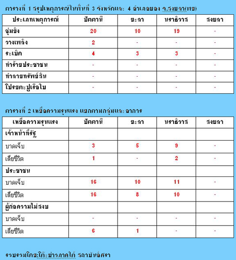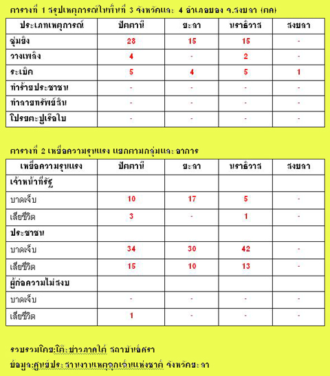 ปัตตานี 42 ราย มีเจ้าหน้าที่รัฐเสียชีวิต 1 ราย บาดเจ็บ 3 ราย ประชาชน เสียชีวิต 16 ราย บาดเจ็บ 16 ราย ผู้ก่อความไม่สงบเสียชีวิต 6 ราย