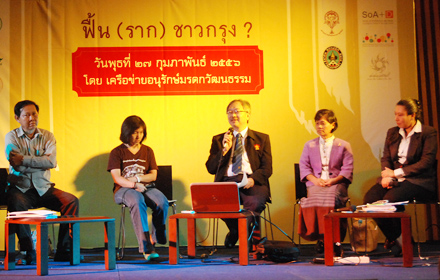 วานนี้ (27 ก.พ.) เครือข่ายอนุรักษ์มรดกวัฒนธรรม จัดงานเสวนาทางวิชาการเรื่อง “ฟื้น (ราก) ชาวกรุง?” ขึ้นที่หอศิลปวัฒนธรรมแห่งกรุงเทพมหานคร สี่แยกปทุมวัน โดยมีนักวิชาการ ตัวแทนชุมชนต่าง ๆ ในกรุงเทพมหานครเข้าร่วมเสนอข้อมูลและแนวทางในการแก้ไขปัญหา