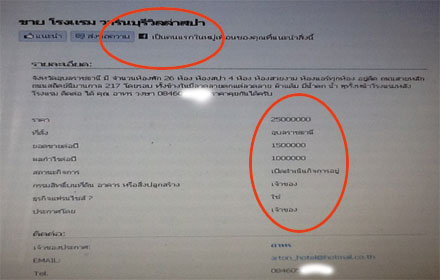 จากการตรวจสอบพบว่า ผู้ลงประกาศขายโรงแรมดังกล่าว คือ นายอาทร วงษาแจ้งหมายเลขอีเมล์ส่วนตัว พร้อมเบอร์โทรศัพท์ติดต่อไว้ชัดเจน คือ 084-605-57XX