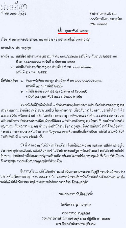โดยแหล่งข่าวระบุว่า สำนักงานศาลยุติธรรมได้ส่งหนังสือด่วนที่สุด ที่ ศย 016/9146 ถึงสำนักงาน อสส. เรื่อง ศาลอาญาขอประสานความร่วมมือระหว่างประเทศในเรื่องทางอาญา ลงวันที่ 22 ก.พ.2556