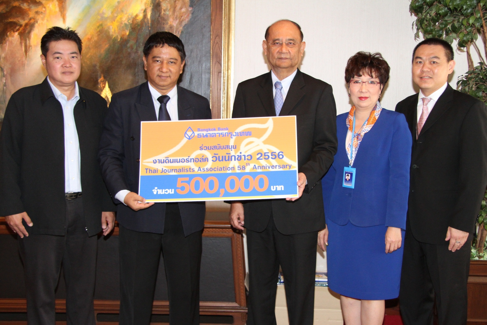 นายโฆสิต ปั้นเปี่ยมรัษฎ์ ประธานกรรมการบริหาร (กลาง) นางปฏิมา ชวลิต เจ้าหน้าที่บริหารระดับ Senior Vice President สายทรัพยากรบุคคล (ที่ 2 จากขวา) และนายอภิวัฒน์ ปุณโณปกรณ์ เจ้าหน้าที่บริหารระดับ Vice President ฝ่ายการประชาสัมพันธ์ (ขวา) ธนาคารกรุงเทพ จำกัด (มหาชน) มอบเงินจำนวน 500,000 บาท (ห้าแสนบาทถ้วน) แก่นายชวรงค์ ลิมป์ปัทมปาณี นายกสมาคม (ที่ 2 จากซ้าย) และนายเสด็จ บุนนาค อุปนายกฝ่ายสิทธิเสรีภาพและการปฏิรูปสื่อ (ซ้าย) สมาคมนักข่าวนักหนังสือพิมพ์แห่งประเทศไทย เพื่อสนับสนุนการจัดงานดินเนอร์ทอล์ค วันนักข่าว 2556 ‘Thai Journalists Association 58th Anniversary’ ในโอกาสครบรอบ 58 ปีของสมาคมฯ โดยในงานจะมีพิธีมอบรางวัลผลการประกวดข่าวประเภทต่างๆ และปาฐกถาพิเศษในหัวข้อ ‘ประเทศไทย ณ จุดเปลี่ยน’ โดย ศาสตราภิชาน ดร. สมคิด จาตุศรีพิทักษ์ อดีตรองนายกรัฐมนตรี ซึ่งจะจัดขึ้นในวันอังคารที่ 5 มีนาคม 2556 เวลา 17.00 น. ณ ห้องวอเตอร์เกท บอลรูม ชั้น 6 โรงแรมอมารี วอเตอร์เกท ประตูน้ำ ทั้งนี้ ธนาคารกรุงเทพเป็นหนึ่งในผู้สนับสนุนหลักที่ได้ให้การสนับสนุนการจัดงานนี้ติดต่อกันมาเป็นเวลาหลายปี ด้วยตระหนักถึงความสำคัญของผู้ประกอบวิชาชีพสื่อมวลชน ซึ่งทำหน้าที่ตรวจสอบและนำเสนอความคิดเห็นในการสร้างสรรค์สังคม