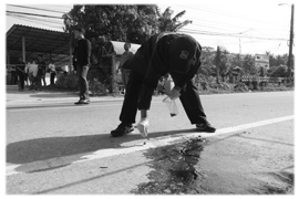 บรรยายภาพ : เจ้าหน้าที่กำลังเก็บหลักฐานรอยเลือดบนถนนจากเหตุรุนแรงที่ อ.ปะนาเระ จ.ปัตตานี (ภาพโดย อับดุลเลาะ หวังนิ ปรับแต่งสีโดย ฝ่ายศิลป์ ทีมข่าวอิศรา)