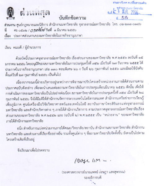 นอกจากนี้ ศูนย์สื่อสารองค์กรของจุฬาฯ ยังได้ส่งบันทึกข้อความที่ ศธ 0512/01747 ด่วนที่สุด ลงวันที่ 1 มี.ค.2556 ที่ออกตามประกาศจุฬาฯ เรื่อง ส่วนงานของมหาวิทยาลัย พ.ศ.2556 ลงวันที่ 26 ก.พ.2556 และมีการส่งเวียนไปยัง คณบดี/ผู้อำนวยการ ภายในจุฬาฯ มาให้ โดยสาระสำคัญของบันทึกดังกล่าว ระบุว่า เนื่องจากขณะนี้ฝ่ายบริหารจุฬาฯ อยู่ระหว่างการปรับโครงสร้างหน่วยงานภายใต้ประกาศดังกล่าว เพื่อให้การดำเนินการของมหาวิทยาลัยเป็นไปอย่างต่อเนื่อง สภามหาวิทยาลัยจุฬาฯ เมื่อวันที่ 28 ก.พ.2556 จึงได้มีมติให้ 1.สำนักงานจัดการระบบเทคโนโลยีสารสนเทศ 2.สำนักงานเครือข่ายการเรียนรู้เพื่อภูมิภาค 3.ศูนย์เครื่องมือวิจัยวิทยาศาสตร์และเทคโนโลยี 4.สถาบันภาษาไทยสิรินธร และ 5.สำนักบริหารต่างๆ ภายใต้สำนักงานวิชาการ เป็น “หน่วยงาน” ของมหาวิทยาลัย ภายใต้สำนักงานมหาวิทยาลัย จุฬาฯ