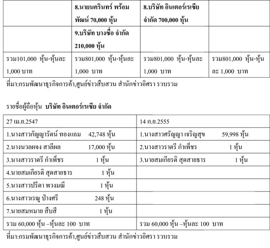 บริษัท อินเตอร์เรเซีย จำกัด (เข้ามาถือหุ้นในช่วง 8 ก.ย.2546) จดทะเบียนวันที่ 29 สิงหาคม 2521 ทุนเริ่มแรก 6 ล้านบาท ปัจจุบัน 50 ล้านบาท ประกอบกิจการค้าที่ดิน จัดสรรที่ดิน หรือสิ่งปลูกสร้าง หรือที่ดินพร้อมสิ่งปลูกสร้าง ที่ตั้งสำนักงาน 2 แห่ง1/126 ถนนจรัสเมือง แขวงรองเมือง เขตปทุมวัน กรุงเทพมหานคร และ ที่ตั้งสำนักงานบัญชี เลขที่ 51/416-418 ซ.ลาดพร้าว 130 ถ.ลาดพร้าว แขวงคลองจั่น เขตบางกะปิ กรุงเทพมหานคร นางสาวกัญญารัตน์ ทองแถม เครือญาตินางวันเพ็ญ พร้อมพัฒน์ ภรรยานายสันติ ถือหุ้นใหญ่ 42,748 หุ้น ต่อมาปี 2552 นางสาวศรัญญา เจริญสุข ถือหุ้นใหญ่ 59,998 หุ้น จากทั้งหมด 60,000 หุ้น มูลค่าหุ้นละ 100 บาท (ดูตาราง)