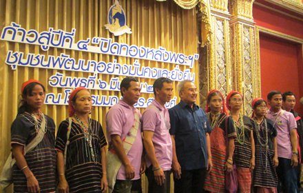โดยในปี 2555 ที่ผ่านมา มูลนิธิปิดทองหลังพระฯ ยังมีบทบาทสำคัญในการประสานความร่วมมือกับหลายส่วนราชการ ได้แก่ กองทัพบก กษ. มท. ทส. และจังหวัดเพชรบุรี ในการแก้ไขปัญหาของชาวกะหร่าง บ้านโป่งลึก-บางกลอย ในพื้นที่ป่าต้นน้ำอุทยานแห่งชาติแก่งกระจาน ซึ่งเคยมีความขัดแย้งกับอุทยานกรณีการจำกัดสิทธิการทำกินในพื้นที่ป่าอนุรักษ์ ทำให้ชาวบ้านที่อยู่มาก่อนอดอยาก ทำมาหากินลำบาก จนกระทั่งทุกอย่างได้รับการคลี่คลาย และชาวกะหร่างมีชีวิตความเป็นอยู่ที่ดีขึ้น โดยไม่ต้องตัดไม้ทำลายป่า ด้วยการส่งเสริมการเลี้ยงสัตว์ ทำแปลงผัก และพัฒนาระบบน้ำให้เข้าถึงครัวเรือน