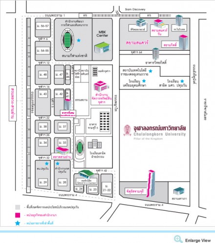 (แผนผังเขตจัดการผลประโยชน์บริเวณเขตปทุมวันของสำนักงานจัดการทรัพย์สิน จุฬาฯ - คลิกเพื่อขยาย)
