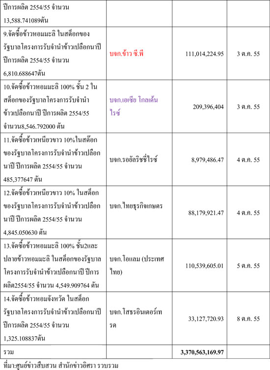 สำนักข่าวอิศรา www.isranews.org ตรวจสอบพบว่า ระหว่างวันที่ 14 กันยายน -8 ตุลาคม 2555 องค์การตลาดเพื่อเกษตรกร (อตก.) ได้ทำสัญญาซื้อขายข้าวในสต็อกรัฐบาล โครงการรับจำนำข้าวเปลือกนาปี ปีการผลิต 2554/55 ให้เอกชน 11 ราย จำนวน 179,895 ตัน รวมวงเงิน 3,370,563,169.97 บาท ได้แก่