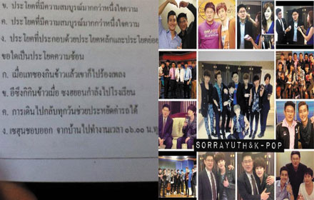 ผู้สื่อข่าวสำนักข่าวอิศรา www.isranews.org ตรวจสอบพบว่า เมื่อวันที่ 10 มีนาคม 2556 ที่ผ่านมา แฟนเพจ FACEBOOk ต่อต้านกระแสเกาหลีในประเทศไทยหลายแห่ง ได้โพสต์รูปภาพเอกสารข้อสอบวิชาภาษาไทย ที่มีการระบุชื่อคนเกาหลี อยู่ในตัวเลือกคำตอบ เช่น ก. เมื่อแทซองกินข้าวเขาก็ไปร้องเพลง ข. อีซึงกิกินข้าว เมื่อ ซงฮยอนกำลังไปโรงเรียน เป็นต้น พร้อมแสดงความไม่เห็นด้วย