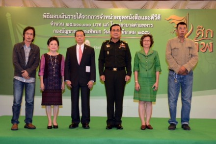 พลเอกประยุทธ์ จันทร์โอชา ผู้บัญชาการทหารบก และนายบัณฑูร ล่ำซำ ประธานกรรมการและประธานเจ้าหน้าที่บริหาร ธนาคารกสิกรไทย ร่วมพิธีมอบเงินจากการจำหน่ายชุดหนังสือและดีวีดี “ศึกเก้าทัพ: ธำรงรัฐ พิพัฒน์สยาม” จำนวน ๒๕,๖๐๐,๐๐๐ บาท ให้กองทัพบก เพื่อบริจาคให้แก่โรงพยาบาลค่ายทหารทั้ง ๓๗ แห่ง ทั่วประเทศ ณ กองบัญชาการกองทัพบก ถนนราชดำเนิน เมื่อเร็ว ๆ นี้