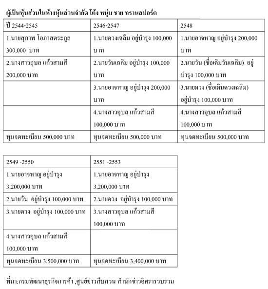 สำนักข่าวอิศรา www.isranews.org ตรวจสอบพบว่า ห้างหุ้นส่วนจำกัด โต้ง หนุ่ม ชาย ทรานสปอร์ต จดทะเบียนวันที่ 22 มกราคม 2539 ทุนปัจจุปัน 3,400,000 บาท ประกอบกิจการขนส่งสินค้า ที่ตั้งเลขที่ 950 ถนนเอกชัย แขวงบางบอน เขตบางบอน กรุงเทพมหานคร