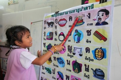 เด็กนักเรียนอนุบาลโรงเรียนไทยรัฐวิทยา 10 จ.นราธิวาส กำลังอ่านภาษามลายูถิ่น ที่นี่เป็น 1 ใน 16 โรงเรียนนำร่อง 4 จังหวัดชายแดนใต้ที่จัดการเรียนการสอนแบบทวิภาษา(มลายูถิ่น–ภาษาไทย)