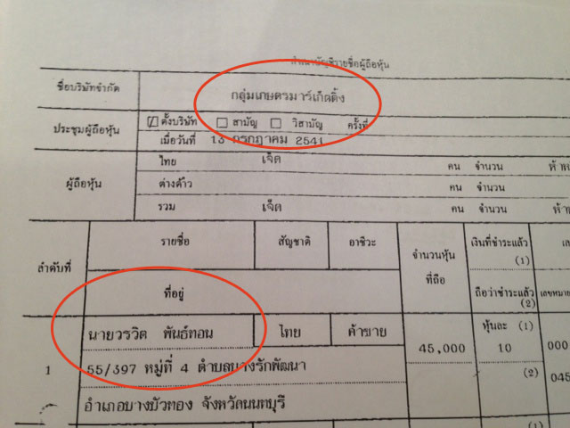 ขณะที่ บริษัท กลุ่มเกษตรมาร์เก็ตติ้ง จำกัด จดทะเบียนวันที่ 16 กรกฎาคม 2551 ทุนเริ่มต้น 5 แสนบาท ตั้งอยู่เลขที่ 78-80 หมู่ที่ 4 ตำบลบางบัวทอง จังหวัดนนทบุรี แจ้งประกอบธุรกิจจำหน่ายข้าวสารบรรจุถุง ปรากฏชื่อ นายวรวิต พันธ์ทอน เป็นกรรมการและผู้ถือหุ้นใหญ่ จำนวน 45,000 หุ้น จากจำนวนหุ้นทั้งหมด 50,000 หุ้น คิดมูลค่าหุ้นละ 10 บาท