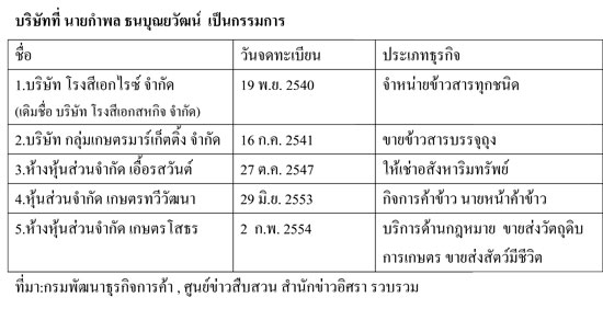 สำนักข่าวอิศรา www.isranews.org ตรวจสอบพบว่า อย่างน้อย 2 บริษัท คือ บริษัท โรงสีเอกไรซ์ จำกัด และ บริษัท กลุ่มเกษตรมาร์เก็ตติ้ง จำกัด จดทะเบียนเพิ่มทุนและเปลี่ยนแปลงกรรมการหลายครั้ง ดังนี้