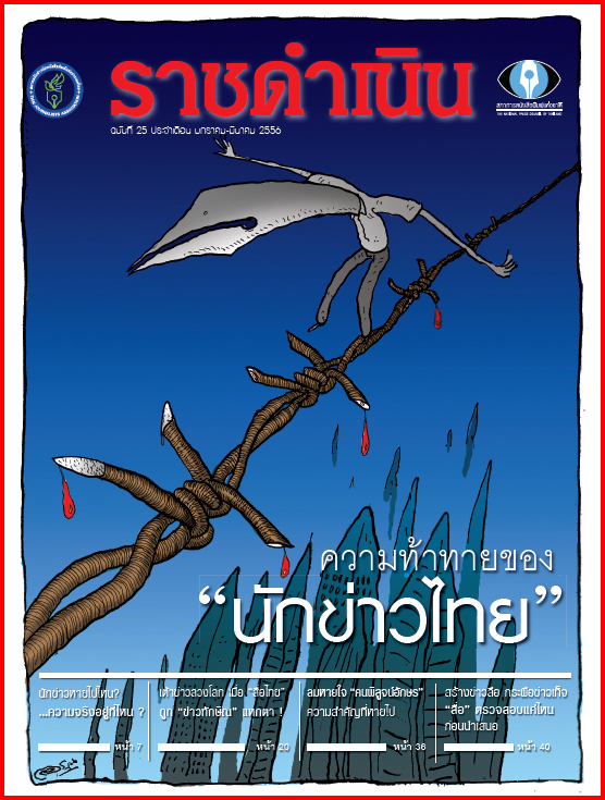 สำหรับใครที่อาจจะยังไม่ทราบ หน้าปก จุลสารราชดำเนิน ฉบับที่ 25 ประจำเดือนมกราคม – มีนาคม พ.ศ.2556 เสียงสะท้อนจากคนข่าวภาคสนาม และการวิจารณ์กันเองภายในวงการสื่อมวลชนไทย รังสรรค์ขึ้นมาโดย อรุณ วัชระสวัสดิ์ การ์ตูนนิสต์ช่องเดียวฝีมือคม ที่กำลังเป็นที่รู้จักจากผลงานประจำใน นสพ.และนิตยสารรายสัปดาห์ ในสื่อเครือ “มติชน” และ “เนชั่น”