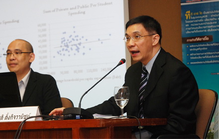 (20 มี.ค.) สถาบันวิจัยเพื่อการพัฒนาประเทศไทย จัดเสวนาสาธารณะเรื่อง “ข้อเสนอเพื่อการปฏิรูปการศึกษาขั้นพื้นฐานเพื่อสร้างความรับผิดชอบ” โดยมี ดร.สมเกียรติ ตั้งกิจวานิชย์ ประธานสถาบันวิจัยเพื่อการพัฒนาประเทศไทย (ทีดีอาร์ไอ) ในฐานะหัวหน้าคณะนักวิจัย นำทีมแถลงผลการศึกษาโครงการวิจัยยุทธศาสตร์การปฏิรูปการศึกษาขั้นพื้นฐานเพื่อสร้างความรับผิดชอบ