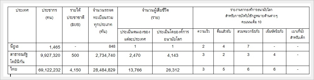 ส่วนอันดับ 2 สาธารณรัฐโดมินิกัน สาธารณรัฐโดมินิกัน เป็นประเทศหนึ่งในทวีปอเมริกาเหนือ ตั้งอยู่บนพื้นที่ 2 ใน 3 ทางทิศตะวันออกของเกาะฮิสปันโยลาซึ่งขนาดใหญ่เป็นอันดับที่ 2 ในหมู่เกาะเกรตเตอร์แอนทิลลิส เกาะนี้ตั้งอยู่ในทะเลแคริบเบียน ทางทิศตะวันตกของเปอร์โตริโก และอยู่ทางทิศตะวันออกของคิวบาและจาเมกา โดยสาธารณรัฐโดมินิกันมีอาณาเขตจรดเฮติทางทิศตะวันตก สาธารณรัฐโดมินิกันเป็นคนละประเทศกับโดมินิกา ซึ่งเป็นประเทศในทะเลแคริบเบียนอีกประเทศ จำนวนรถจดทะเบียนเป็น รถยนต์ 4 ล้อ จำนวน 914,628 คัน รถ 2 ล้อ และ 3 ล้อ รวมกัน 1,352,720 คัน รถบรรทุกหนัก 380,549 คัน รถบัส 73,716 คัน อื่นๆ 13,127 คัน ไม่มีหน่วยงานรับผิดชอบด้านนี้โดยตรง รายงานผู้เสียชีวิตจำนวน 1,902 คน เป็นชาย 85% หญิง 14% ค่าความสูญเสียทางเศรษฐกิจ 0.32% ด้านการบังคับใช้กฎหมาย ไม่มีการหักแต้มผู้กระทำผิด