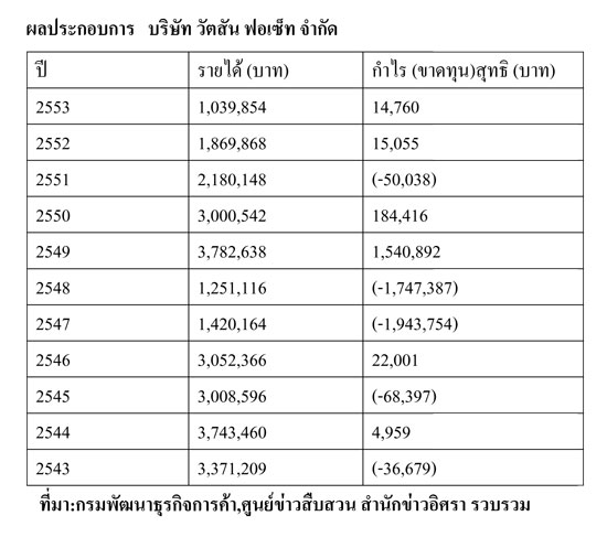 บริษัทแจ้งผลประกอบการ ปี 2553 รายได้ 1,039,854 บาท กำไรสุทธิ 14,760 บาท สินทรัพย์ 19,597,936 บาท หนี้สิน 19,662,109 บาท ขาดทุนสะสม 2,064,172 บาท (ดูตาราง)