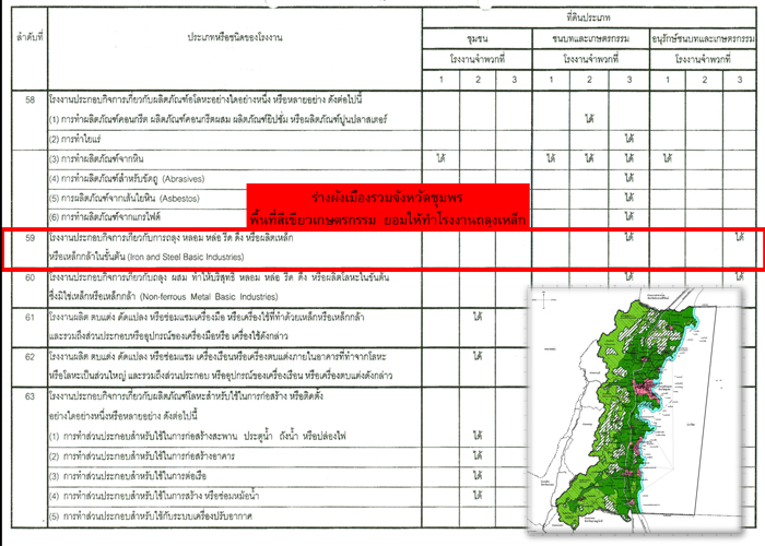 “ตอนเห็นผังเมือง จ.ชุมพรครั้งแรกก็ดูดี แต่พอมาดูบัญชีท้ายข้อกำหนดก็พบว่ามีการหมกเม็ดให้มีโรงไฟฟ้าและโรงถลุงเหล็กและปิโตรเคมีในพื้นที่สีเขียวได้ ซึ่งตามมาตรฐานผังเมืองแล้วอุตสาหกรรมพวกนี้ไม่ควรมีในพื้นที่สีเขียว แต่ถ้าผู้วางผังคิดว่าพื้นที่ในชุมพรควรรองรับการขยายของอุตสาหกรรมพวกนี้ ก็ควรทำวางผังเมืองกำหนดเป็นพื้นที่สีม่วง (อุตสาหกรรม) ไปเลย เพื่อให้ชาวบ้านได้เห็นชัด และมีโอกาสคัดค้าน ไม่ใช่การเอาไปซ่อนอยู่ใต้พรมเขียว เป็นพื้นที่เขียวไม่จริง” ‘ภารนี’ กล่าว![]()